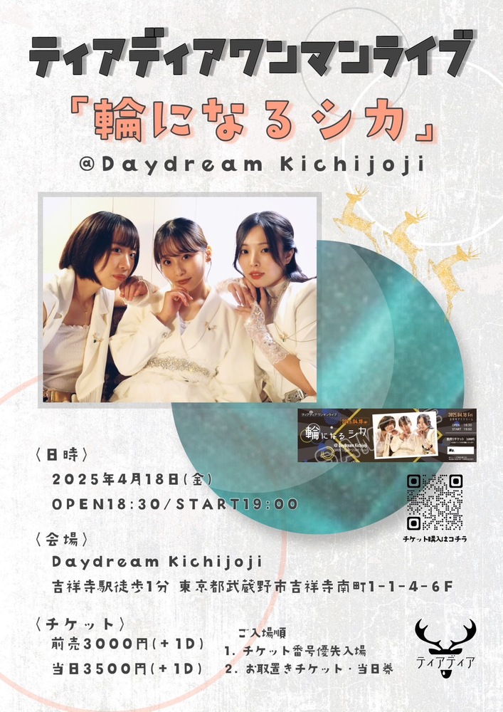 2025年4月18日ワンマンライブ決定しました NEWS #ティアディア ティアディア公式サイト 2025/02/24 11:20 フォロー 日程🗓2025年4月18日(金) 会場📍吉祥寺デイドリーム 時間⏰18:30 OPEN/19:00 START チケット🎫前売3000円(+1D) 当日3500円(+1D)チケットは下記リンクから URLをコピーする 報告する