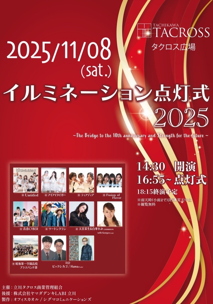 イルミネーション点灯式@タクロス広場 SCHEDULE 2025/11/08(土) 14:30 - 15:00 立川タクロス広場 「立川タクロス広場イルミネーション点灯式 2025」 ~The Bridge to the 10th anniversary and Strength for the future ~ 🗓️11月8日(土) ⏰Start14:30予定 📍立川タクロス広場 🎫観覧無料 URLをコピーする 報告する